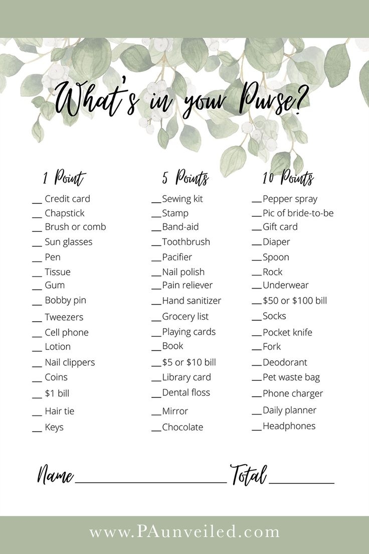 To play the Bridal Shower Purse Game, simply distribute a printable list of items commonly found in a woman’s purse. Guests can then check off the items that they have in their own purses. The person with the most items checked off wins a prize!