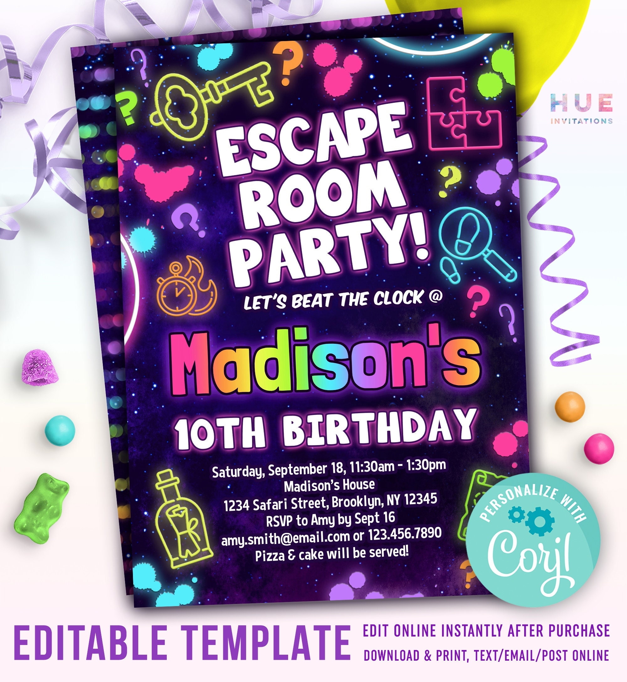 Escape Room Birthday Party Invitation Editable Template Kids Mystery Escape Game Invitation For Girls Boys Bright Neon Rainbow Colors Etsy UK