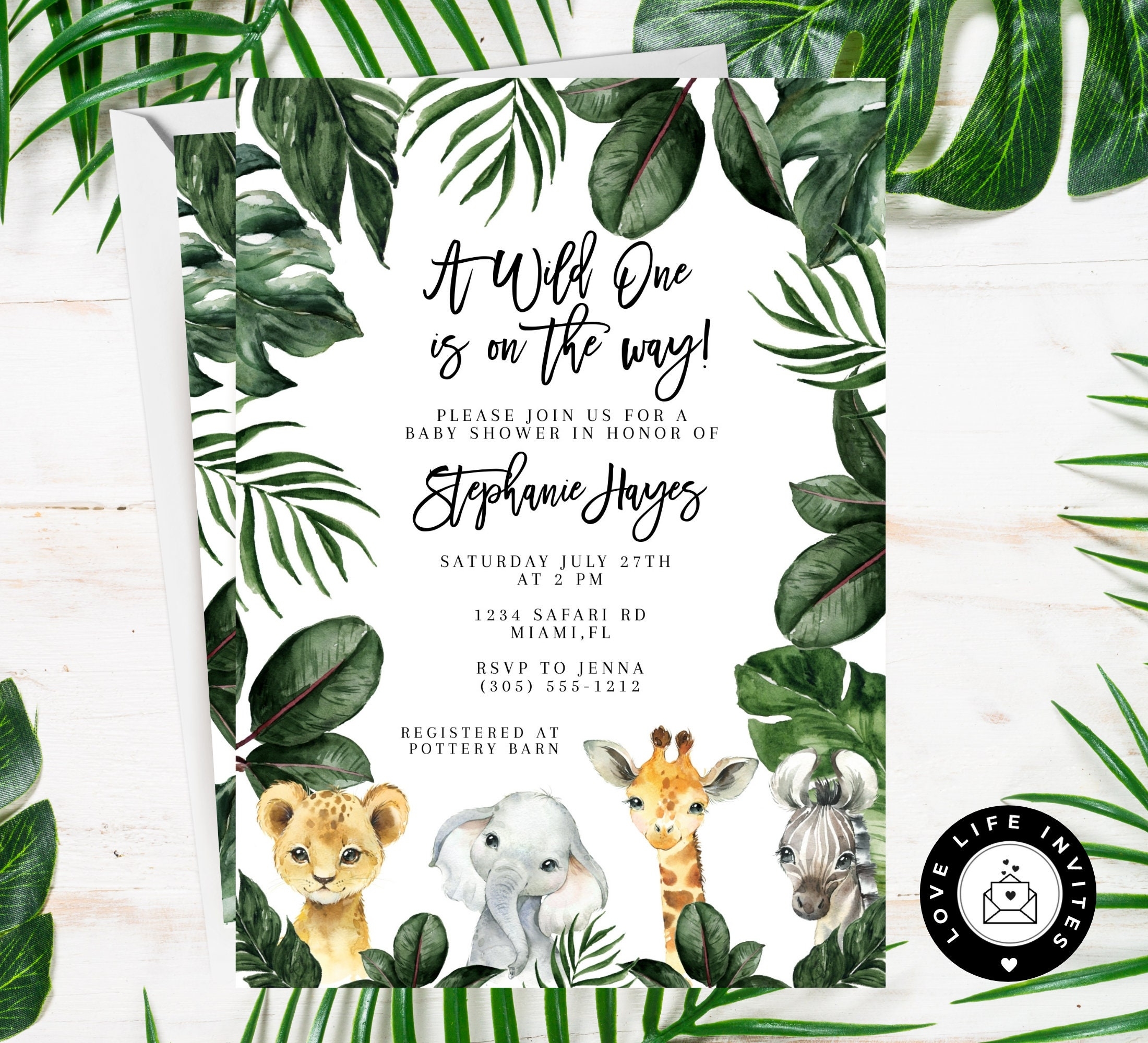 Our jungle-themed invitations feature adorable animals like lions, elephants, and monkeys, all set against a lush green backdrop. The playful design is sure to set the tone for a fun and memorable baby shower.