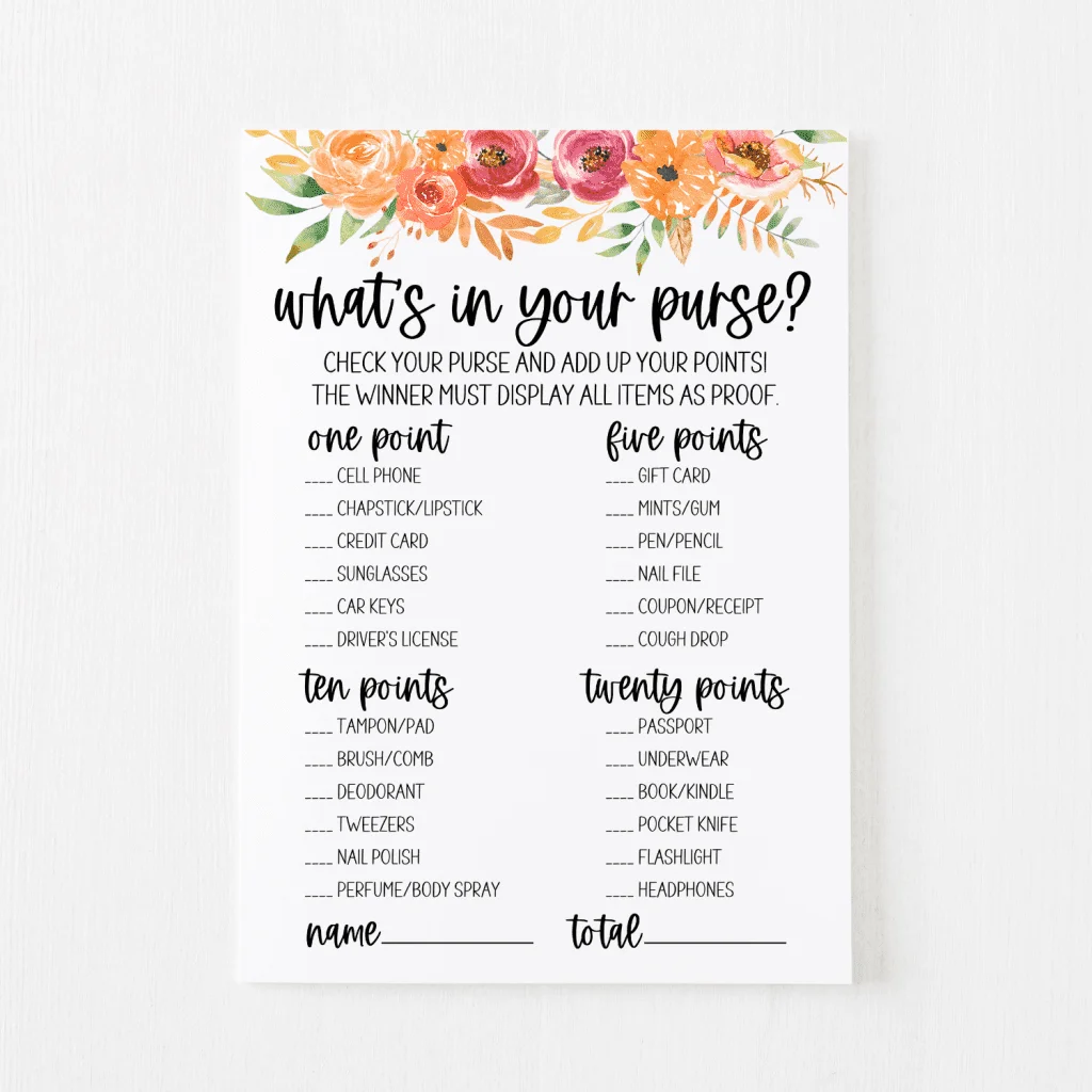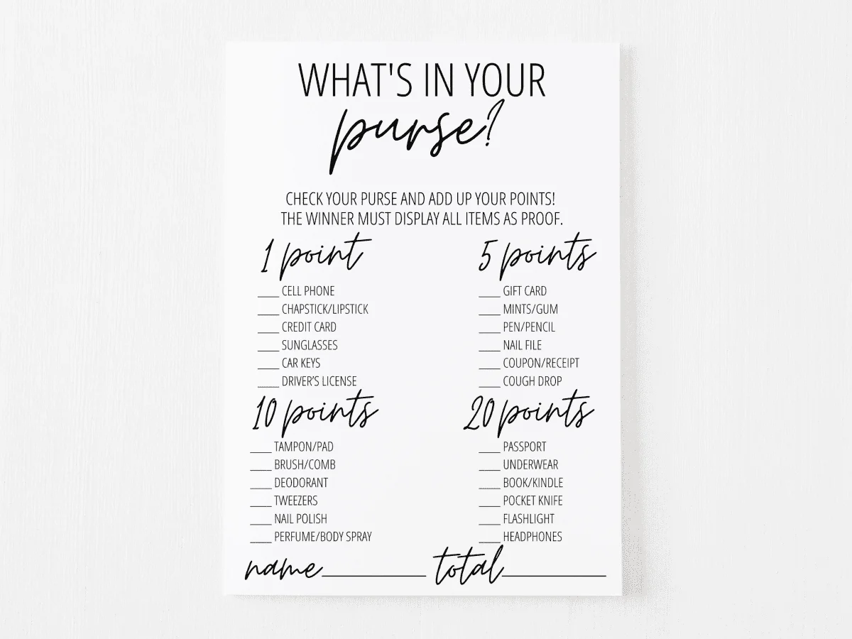 The rules of the game are simple – each guest will go through their purse and check off items on the list that they have. The person with the most items checked off wins a prize! It’s a great way to get everyone involved and spark conversations.